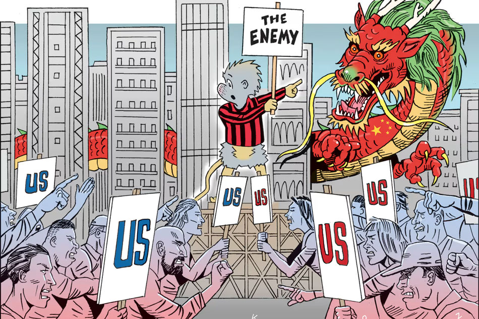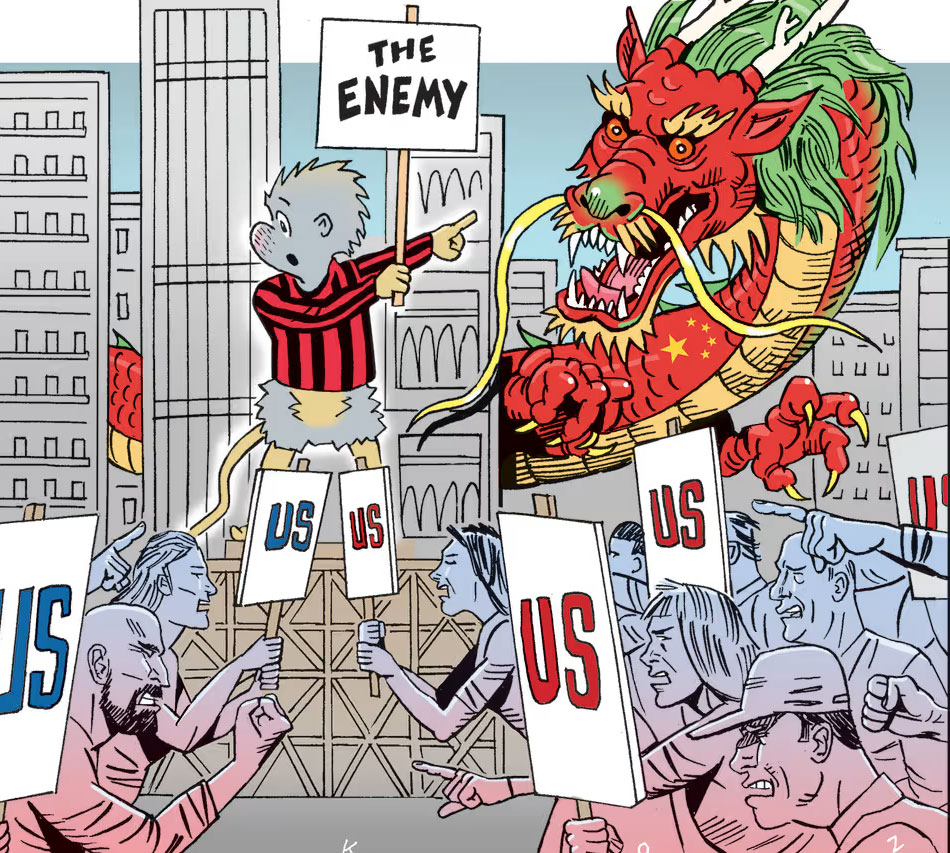 美国漫画家把中国龙描绘成敌人 前芝加哥市长、奥巴马白宫办公厅主任拉姆. 伊曼纽尔八月底在《华尔街日报》发表署名文章,号召美国人放下分歧、停止内斗,集中精力对付中国。 We Have Met the Enemy and He Isn't Us 该文配了一幅政治漫画:卡通角色负鼠波哥一只手举着牌子,上面写着 The Enemy(敌人),另一只手指向一头面目狰狞的中国龙,而蓝队美国人(支持民主党)与红队美国人(支持现任总统特朗普)正互相指责对方不能代表美国。 |