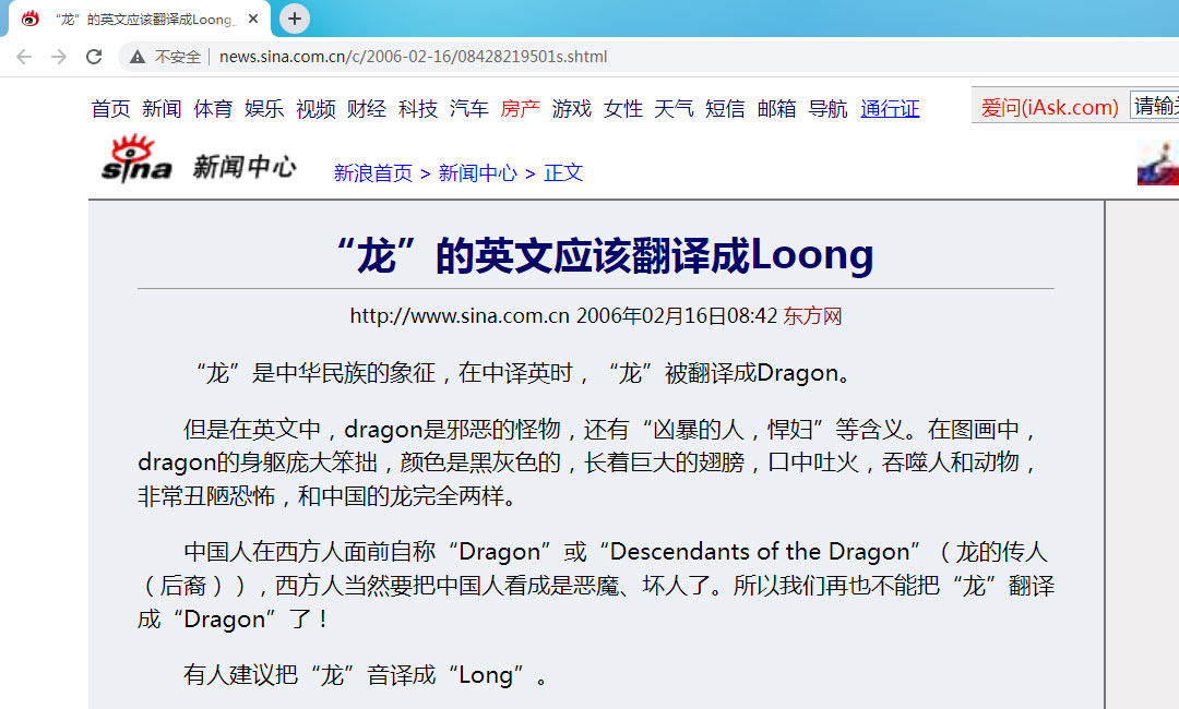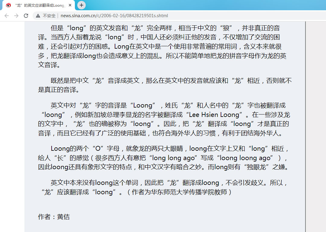 新浪网的转载: “龙”的英文应该翻译成 Loong “龙”是中华民族的象征,在中译英时,“龙”被翻译成 Dragon。 但是在英文中,dragon 是邪恶的怪物,还有“凶暴的人,悍妇”等含义。在图画中,dragon 的身躯庞大笨拙,颜色是黑灰色的,长着巨大的翅膀,口中吐火,吞噬人和动物,非常丑陋恐怖,和中国的龙完全两样。 中国人在西方人面前自称“Dragon”或“Descendants of the Dragon”(龙的传人(后裔)),西方人当然要把中国人看成是恶魔、坏人了。所以我们再也不能把“龙”翻译成“Dragon”了! 有人建议把“龙”音译成“Long”。 但是“long”的英文发音和“龙”完全两样,相当于中文的“狼”,并非真正的音译。当西方人指着龙说“long”时,中国人还必须纠正他的发音,不仅增加了交流的困难,还会引起对方的困惑。Long 在英文中是一个使用非常普遍的常用词,含义本来就很多,把龙翻译成 long 也会造成意义上的混乱。所以不能简单地把龙的拼音字母作为龙的英文音译。 既然是把中文“龙”音译成英文,那么在英文中的发音就应该和“龙”相近,否则就不是真正的音译。 英文中对“龙”字的音译是“Loong”,姓氏“龙”和人名中的“龙”字也被翻译成“loong”,例如新加坡总理李显龙的名字被翻译成“Lee Hsien Loong”。在一些涉及龙的文字中,“龙”也的确被称为“loong”。因此,把“龙”翻译成“loong”才是真正的音译,而且它已经有了广泛的使用基础,也符合海外华人的习惯,有利于团结海外华人。 Loong 的两个“o”字母,就象龙的两只大眼睛,loong 在文字上又和“long”相近,给人“长”的感觉(很多西方人有意把“long long ago”写成“loong loong ago”),因此 loong 还具有象形文字的特点,和中文汉字有暗合之妙。而 long 则有“独眼龙”之嫌。 英文中本来没有 loong 这个单词,因此把“龙”翻译成 loong,不会引发歧义。所以,“龙”应该翻译成“loong”。(作者为华东师范大学传播学院教师) 作者:黄佶 |