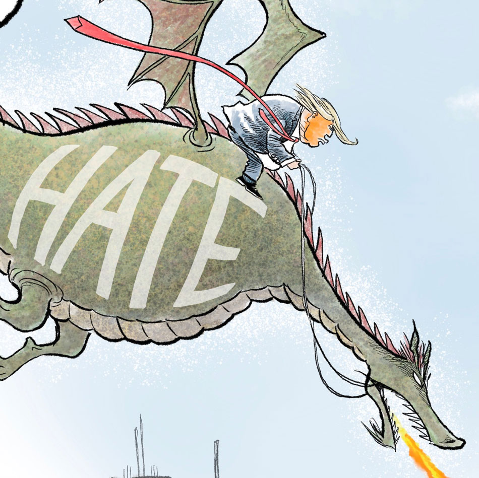 漫画作者显然在表达一个意思:恰恰是特朗普在宣扬仇恨,使美国陷入了严重的危机。 杜拉根兽在欧美等广大地区代表邪恶和混乱,被用来象征各种负面事物。本编之前也收集到用杜拉根兽象征仇恨的时政漫画。 |