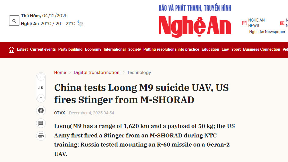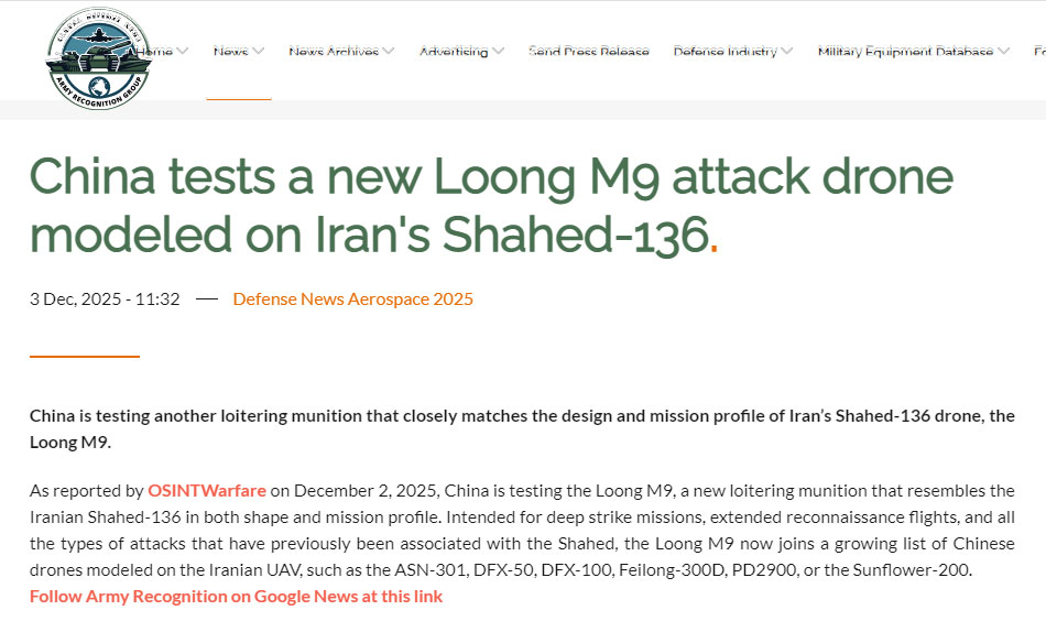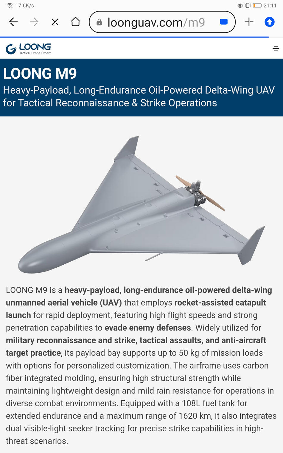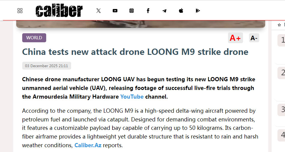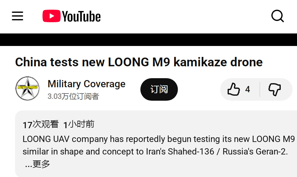 外媒报道中国 Loong M9 无人机试飞消息 LOONG M9 自杀式无人机由中国无人机公司 LOONG UAV 研制,最近进行了测试,一些海外媒体进行了报道。 |