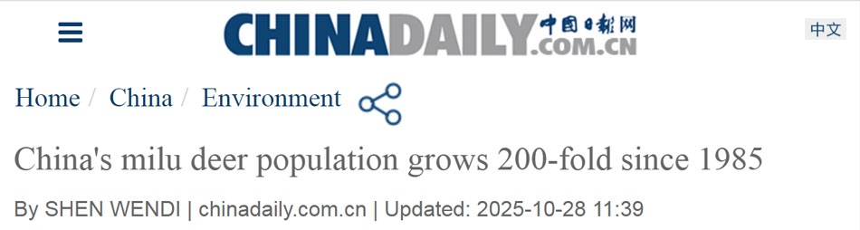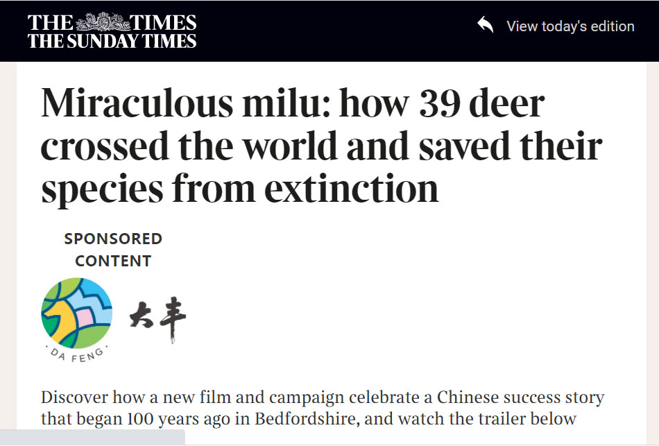 今年英国《泰晤士报》以“Miraculous milu(麋鹿奇迹)”为题,报道中国麋鹿从返乡到种群复壮的历程。 |
