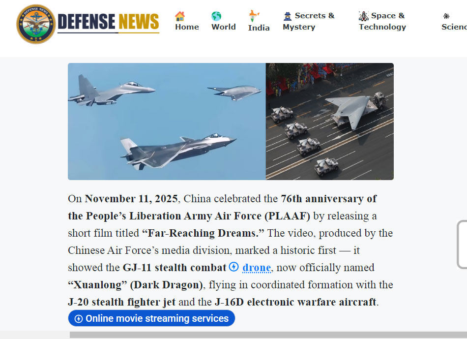 On November 11, 2025, China celebrated the 76th anniversary of the People’s Liberation Army Air Force (PLAAF) by releasing a short film titled "Far-Reaching Dreams." The video, produced by the Chinese Air Force’s media division, marked a historic first -- it showed the GJ-11 stealth combat drone, now officially named "Xuanlong" (Dark Dragon), flying in coordinated formation with the J-20 stealth fighter jet and the J-16D electronic warfare aircraft.